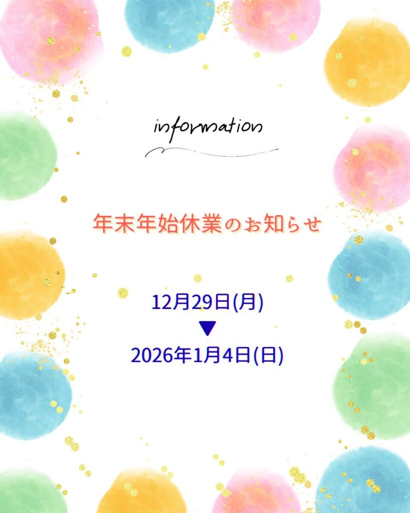 年末年始休業のお知らせ 投稿日 2025年12月18日 著者 khuser カテゴリー NEWS 日頃よりご愛顧いただき、誠にありがとうございます。 誠に勝手ながら、下記の期間を年末年始休業とさせていただきます。 休業期間:12月29日(月)~1月4日(日) ご不便をおかけしますが、どうぞよろしくお願いいたします。